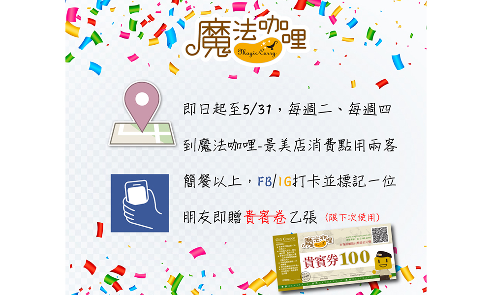 即日起至5/31,每週二、每週四到魔法咖哩-景美店消費點用兩客簡餐以上,FB/IG 打卡並標記一位朋友即贈貴賓券乙張(限下次使用)...